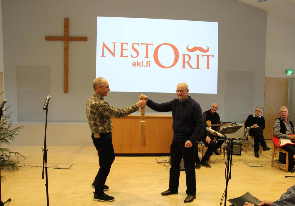 Alla on kuva sauvan luovutuksesta Vaasaan, jossa järjestetään seuraava vuosijuhla. Tuomas Perkiö vastaanottaa sauvan Ylivieskan Seudun Eläkkeensaajien Nestorien vetäjältä.