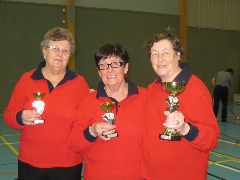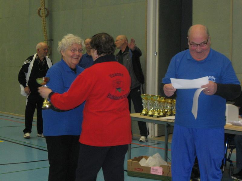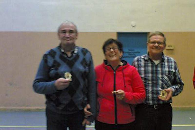 Boccia-naiset saivat piirin kiertopalkinnon omakseen 3/2018. Ahti Helberg ja Pentti Lappalainen luovuttavat pokaalin yhdistyksen puheenjohtaja Liisa Sirenille