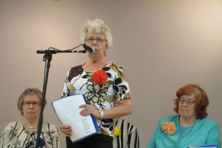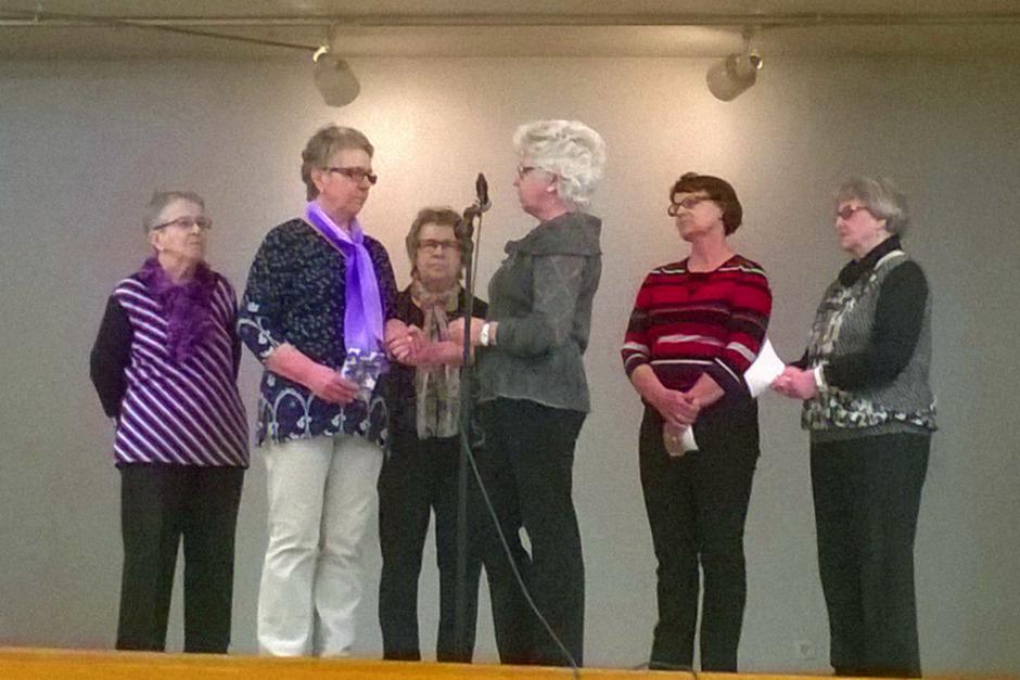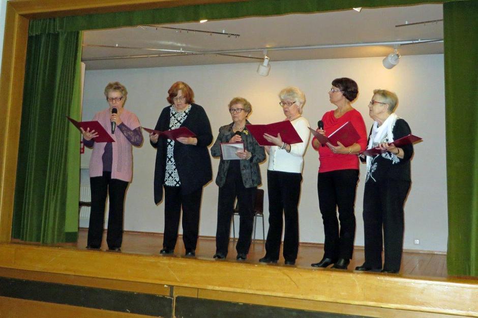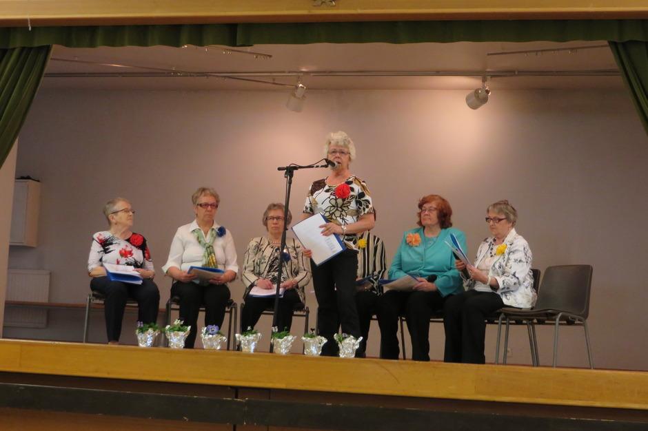 Runoryhmä ystävänpäiväjuhlassa 13.2.2014. Kuvassa vasemmalta Oili Kultti, Sisko Saviaro, Sinikka Kiviniemi, Leena Suomela, Maija Siirilä ja Eila Laasanen. Kuvasta puuttuu Eila Ranta-Kyyny. Kuva K.Laine