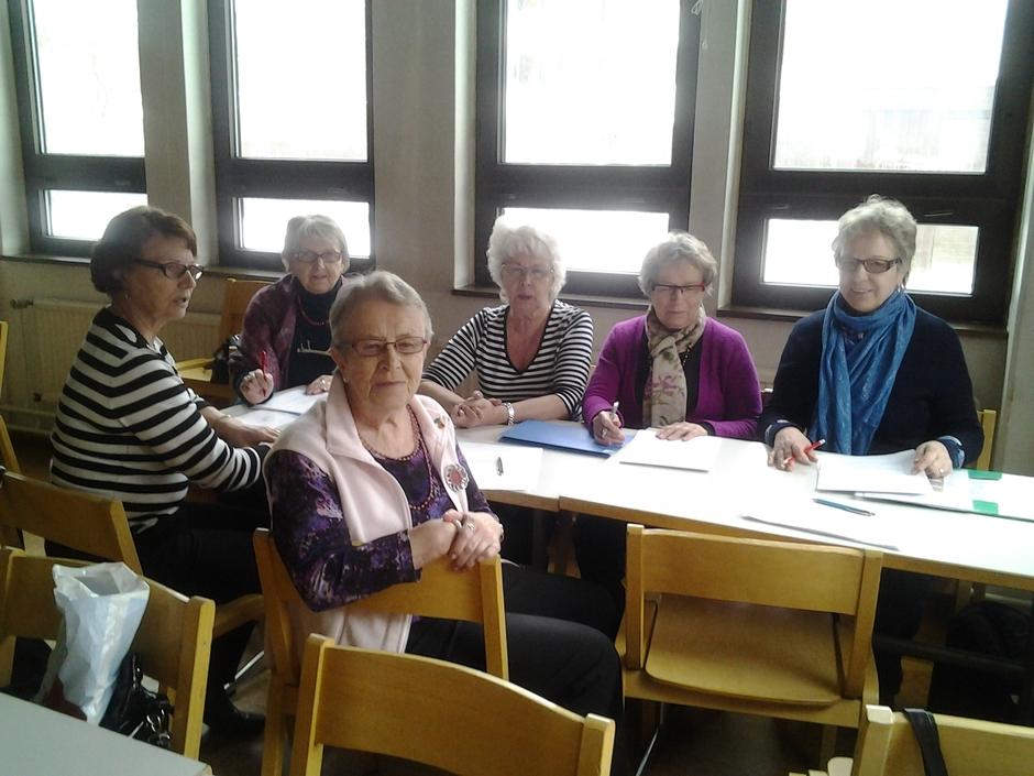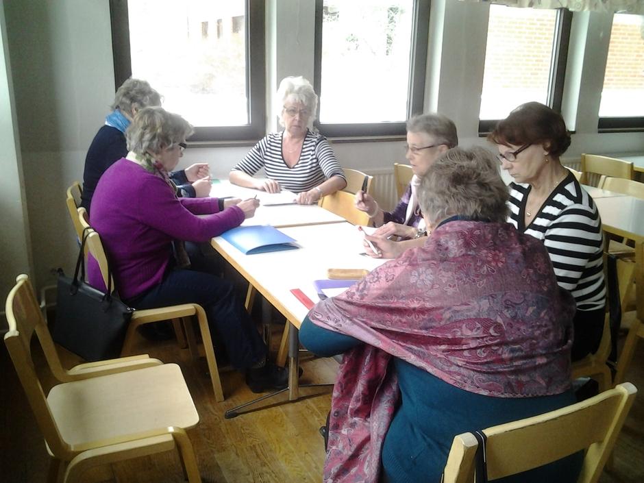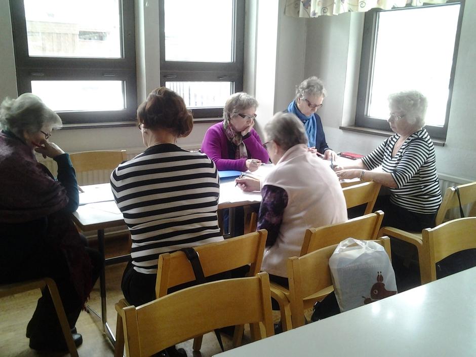 Runoryhmä harjoittelemassa 20.3.2014. Edessä Maija ja Oili, ikkunan vieressä Eila, Leena, Sinikka ja Sisko. Kuva U-M Salo