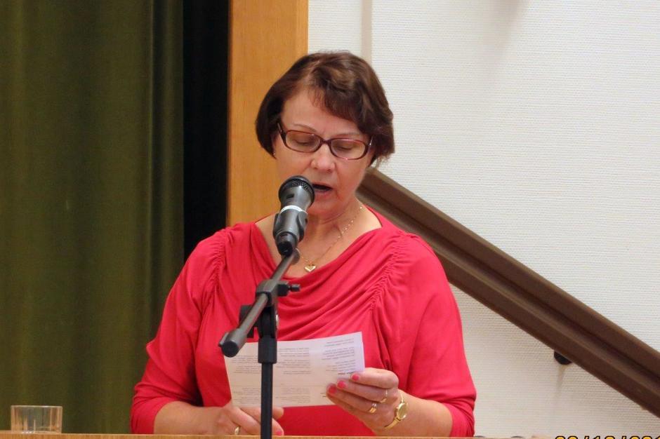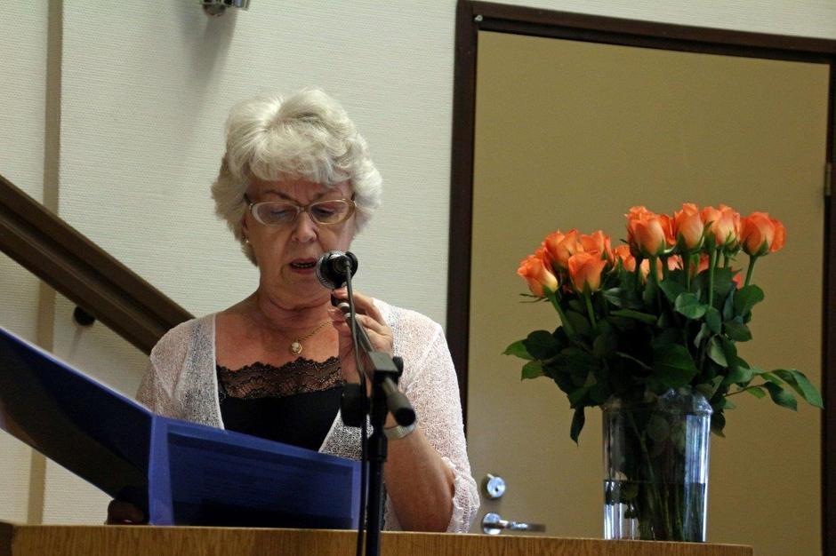 Leena runoryhmän edustajana lausumassa Kesärunoa kavalkadissa 2014-05-22