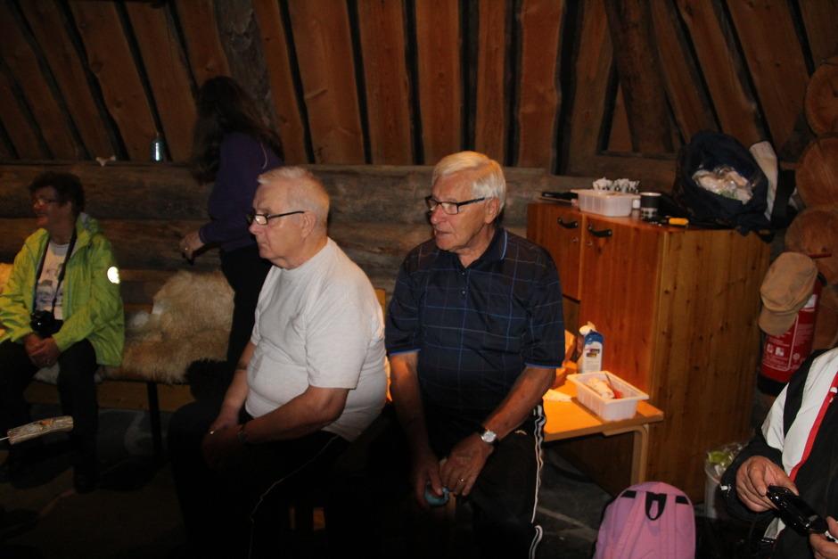 Matkanvetäjät Mauri ja Matti lopen uupuneina, kun väelle on jaettu makkarat