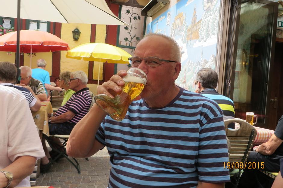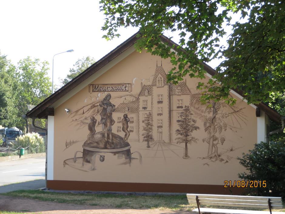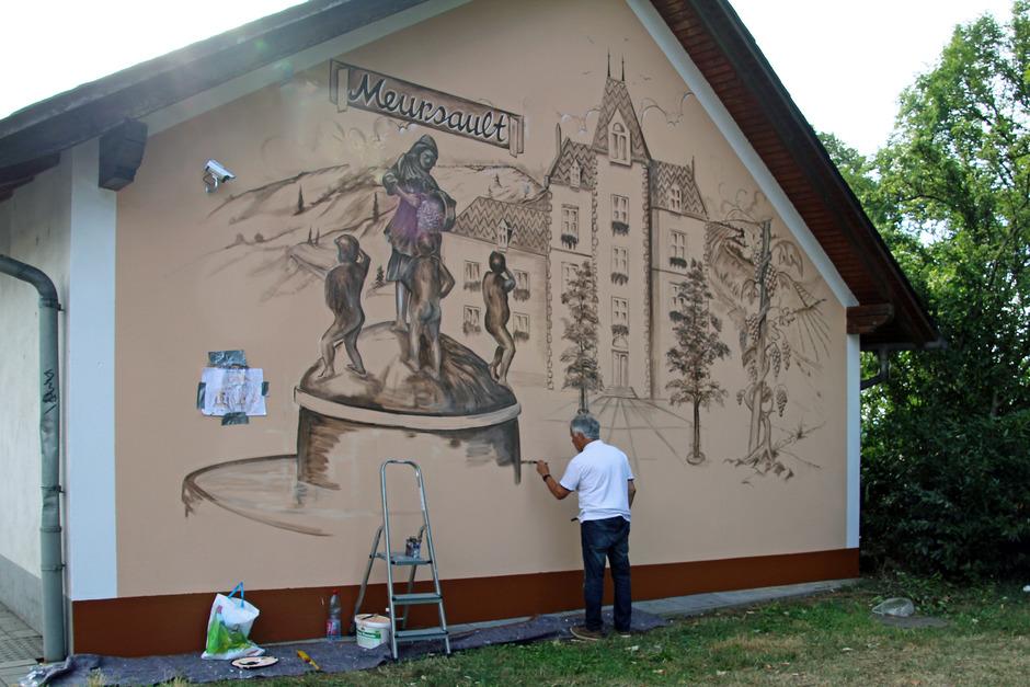 Seinämaalari työssä Rüdesheimissa, mallina pieni paperipala.