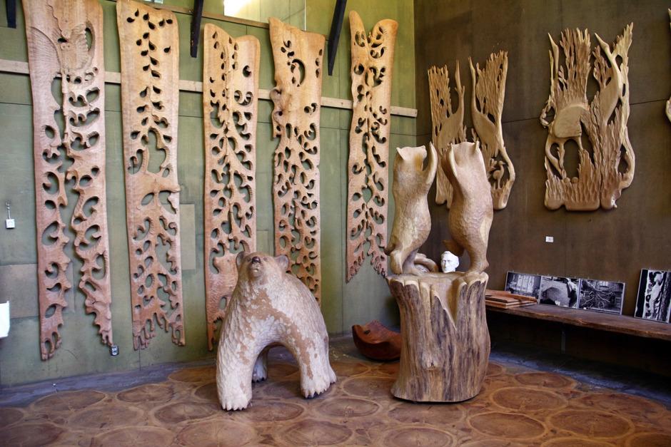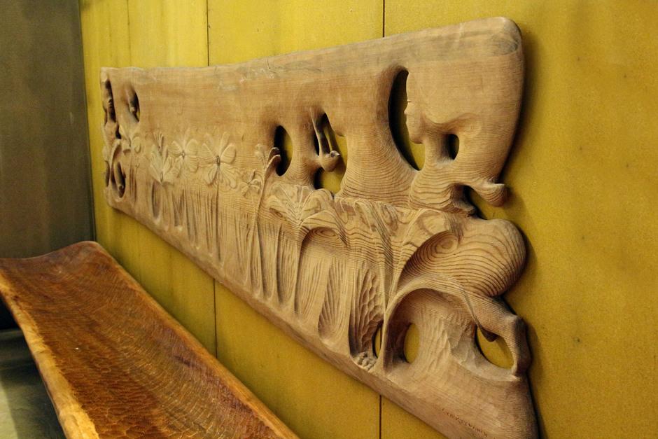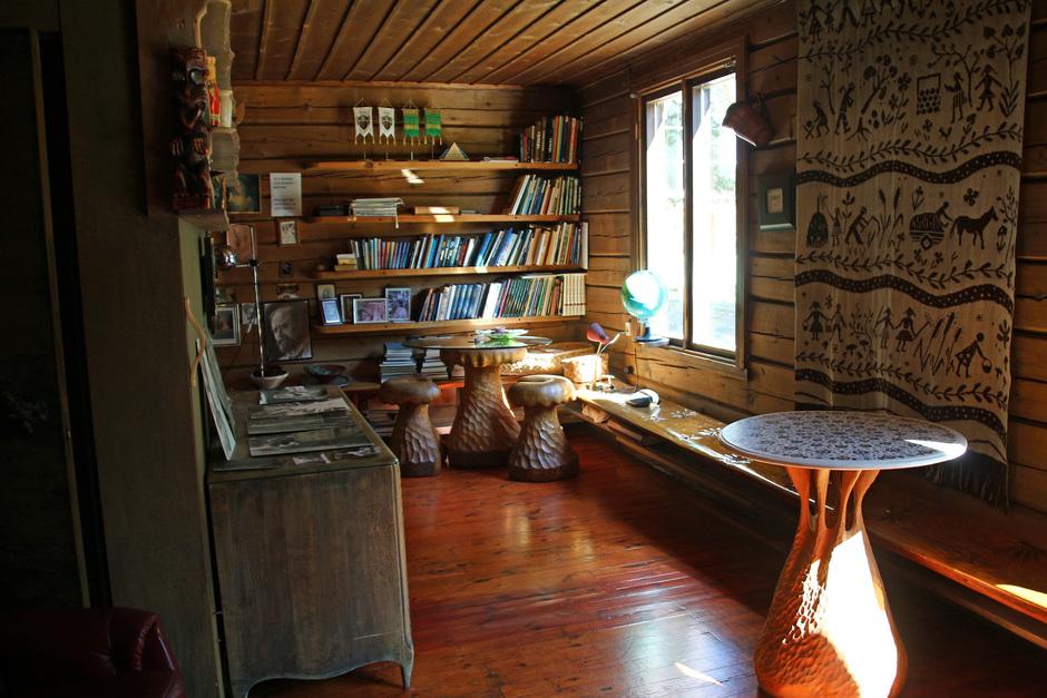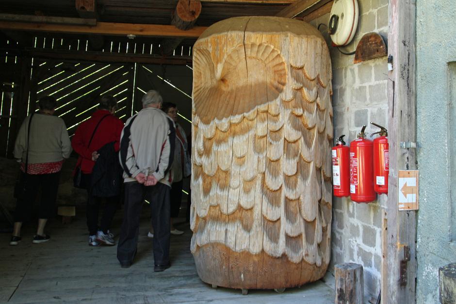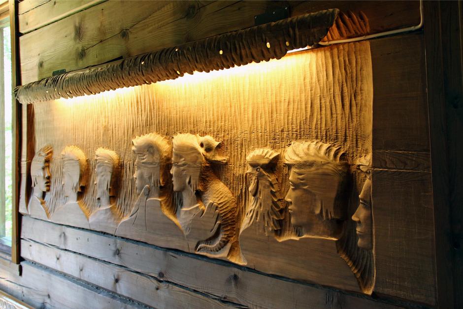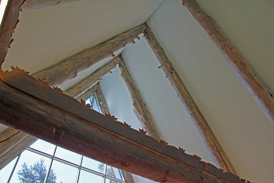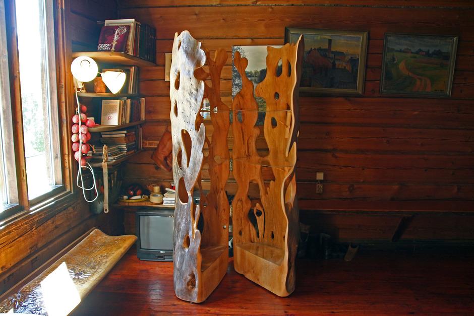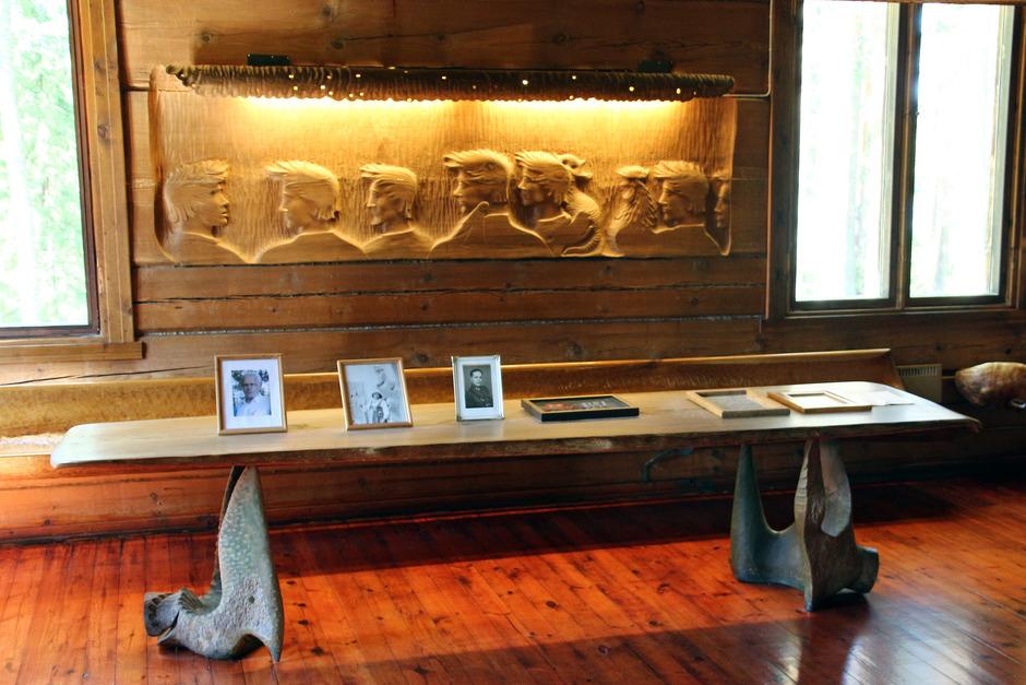 Opas Ryynästen pirtin edessä. Hevosenkengistä tehtyjä onnenapiloita