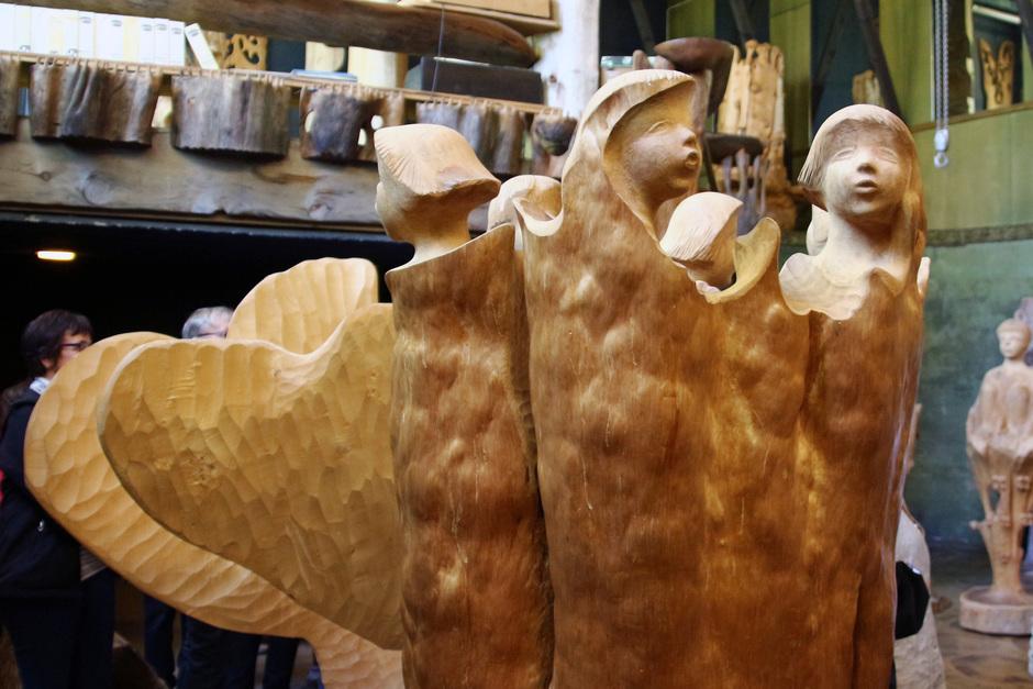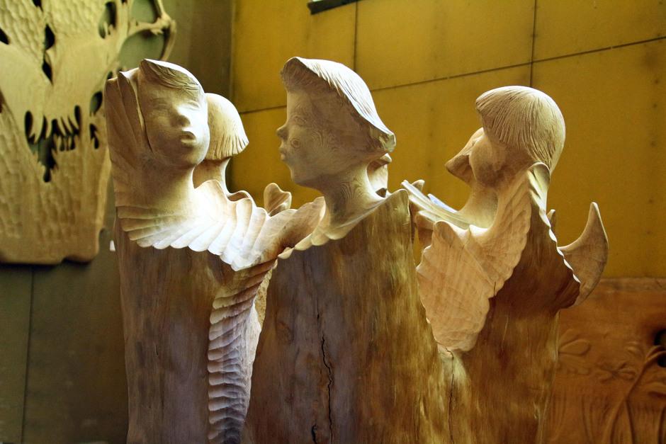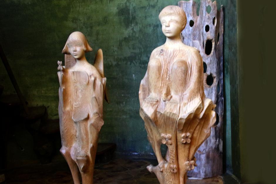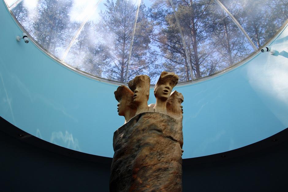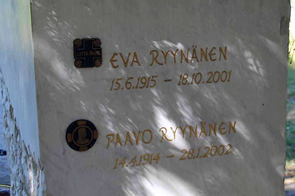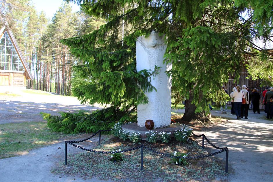 Evan ja Paavon hautamuistomerkki pihassa. Kuusenoksat enkelin siipinä