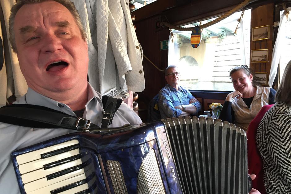 Jokiristeilyn iltapalalla meitä viihdytti haitarinsoittaja. Taustalla Lasse ja Minna. Kuva Erkki Teppo