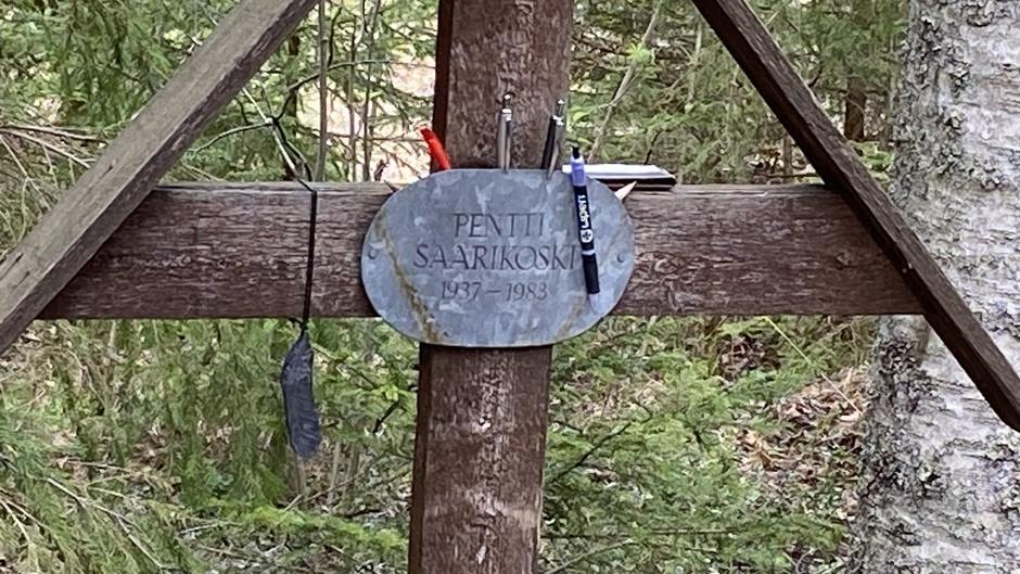 Kirjailija Pentti Saarikosken haudalla muistona kyniä