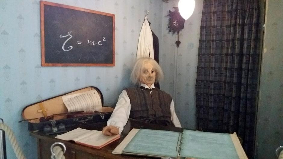 Näyttelytilassa fyysikko Albert Einstein ja seinällä hänen kuuluisa suppea suhteellisuusteoriansa: Energia = massa x valon nopeuden neliö.