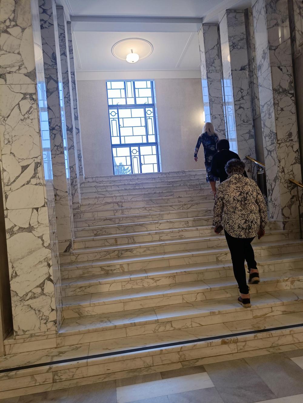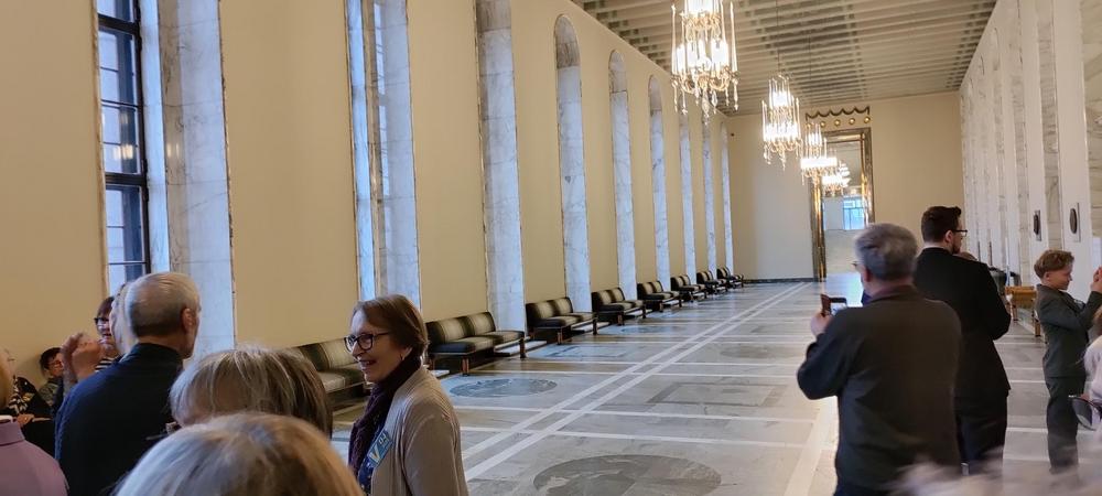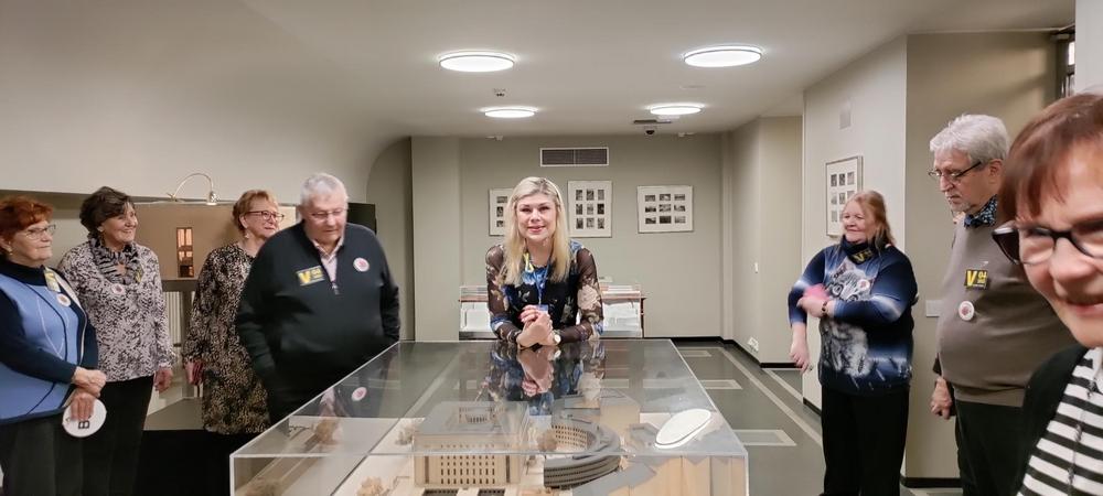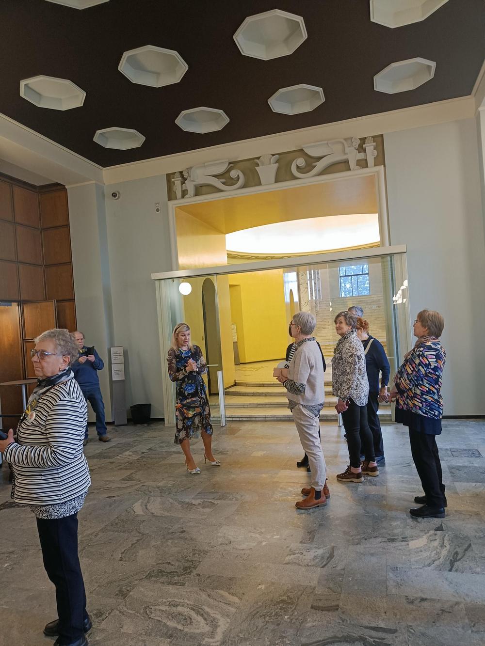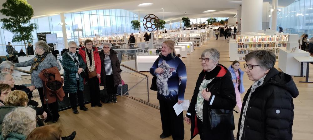 Saku esittelee Oodia, oikealla osa porukasta kiertelemässä kirjastossa