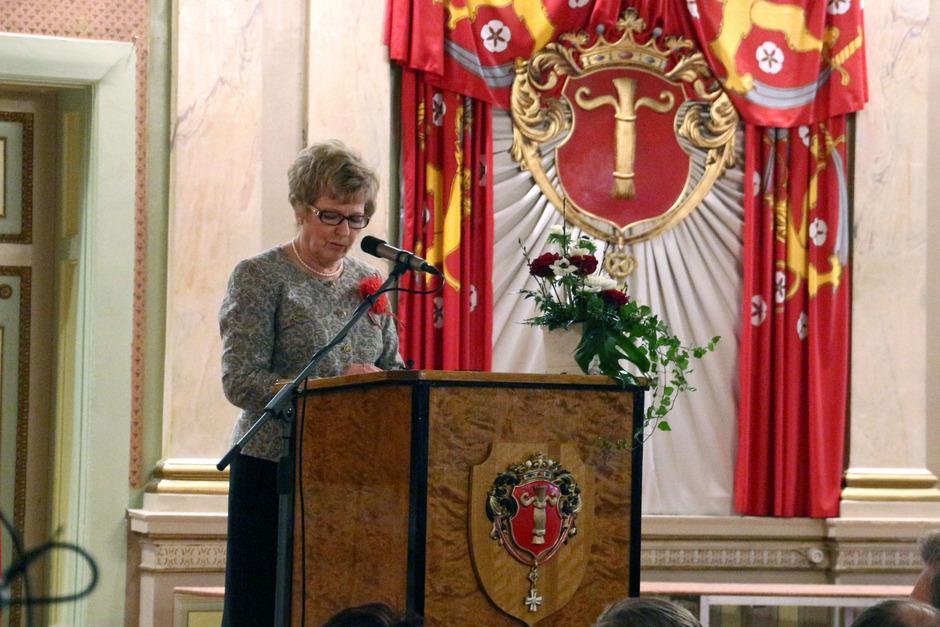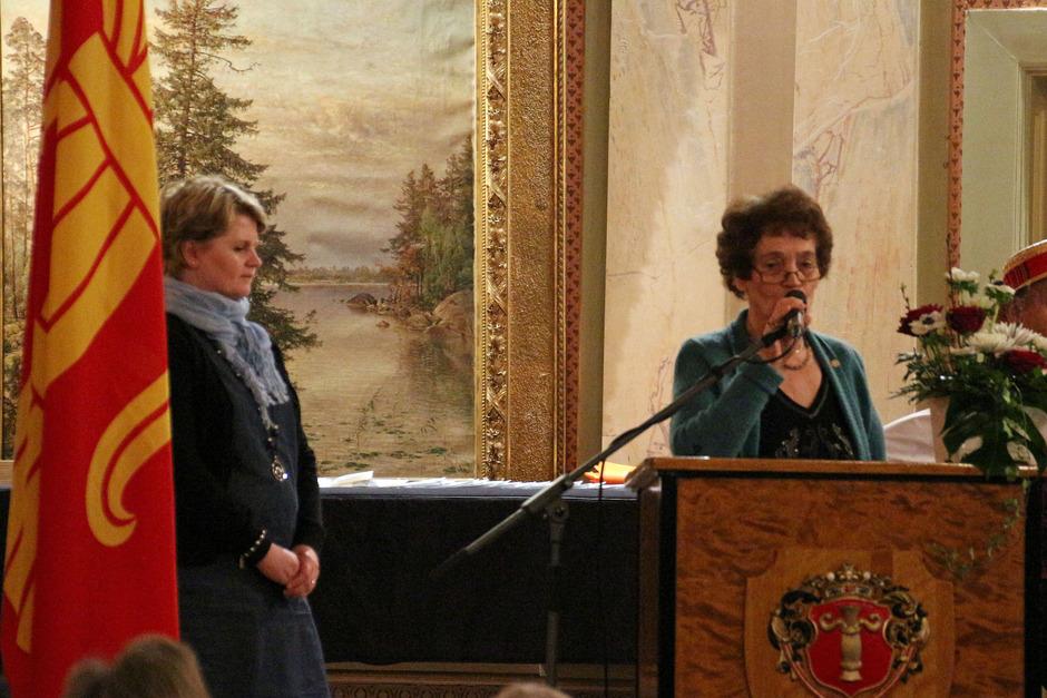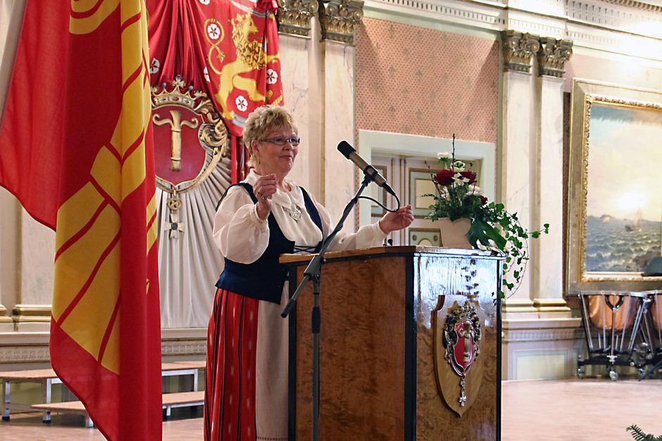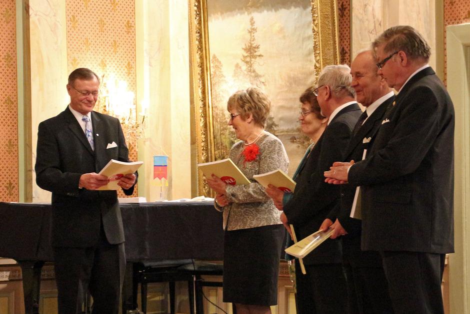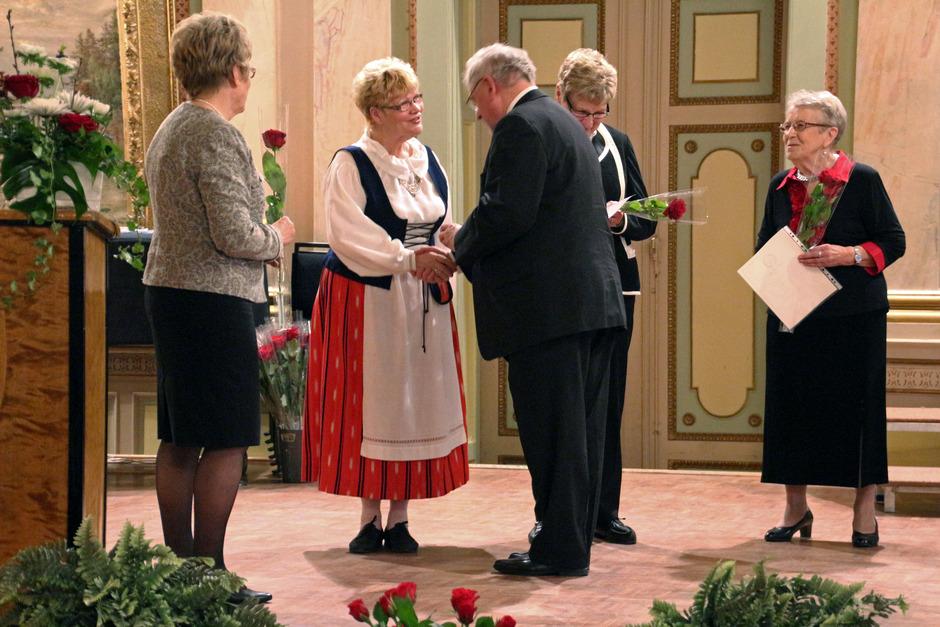 Siht. Ulla-Maija Salo kutsuu ansiomerkkiensaajia estraadille.