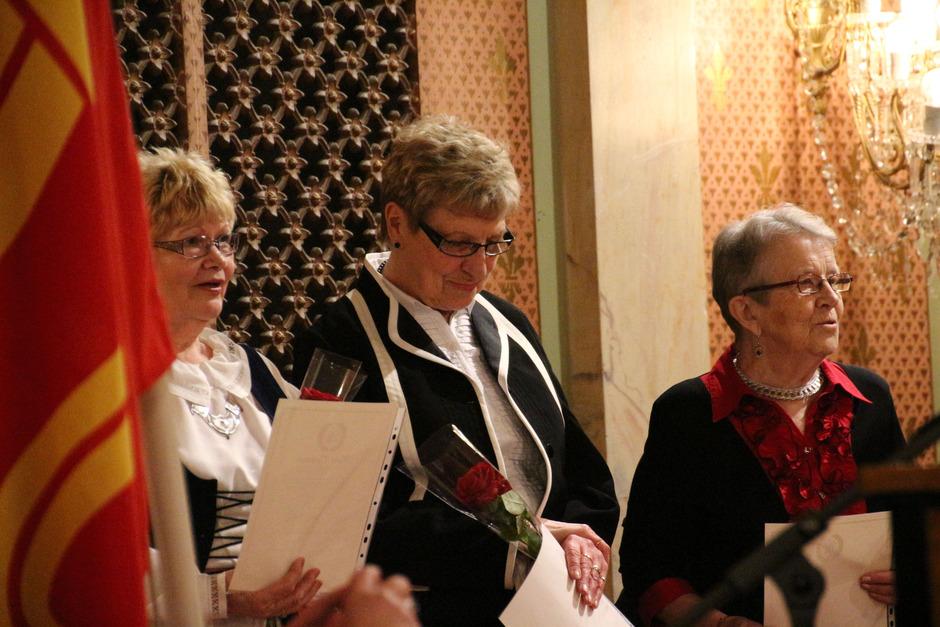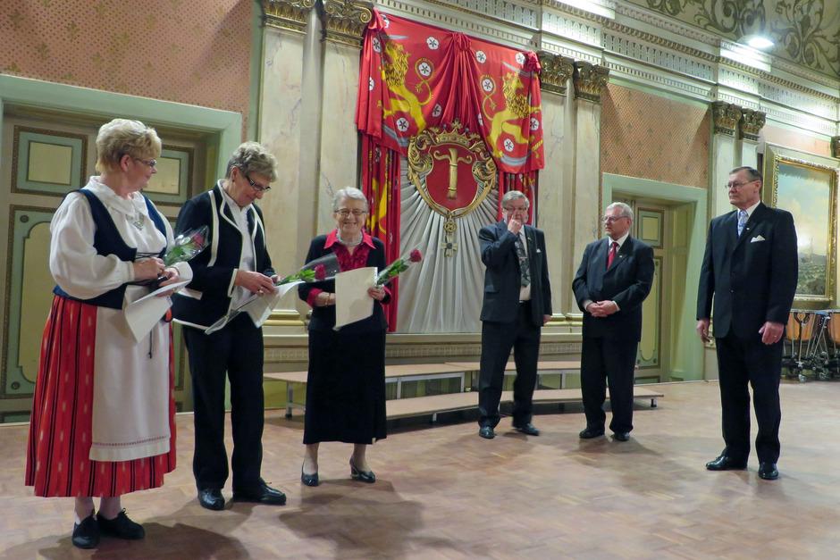 Kultaisten ansiomerkkien saajat Helvi Tuononen, Liisa Palokangas ja Oili Kultti