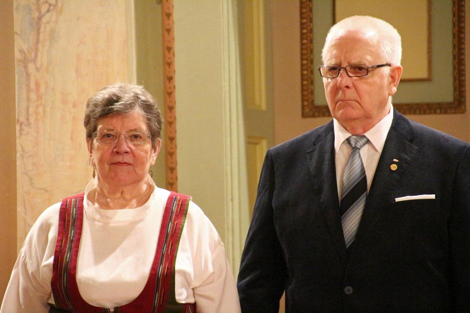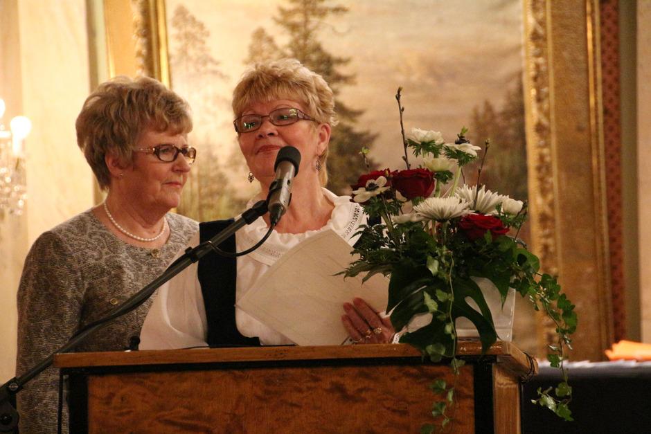 Puheenjohtaja Pauli Karhu ja sihteeri Ulla-Maija Salo valmiina vastaanottamaan onnitteluja