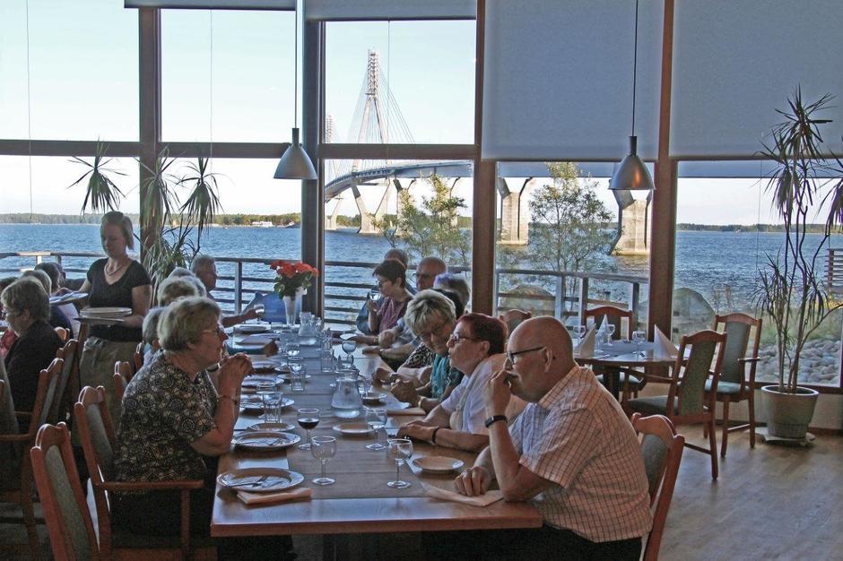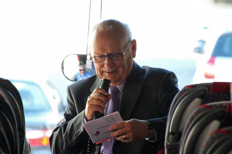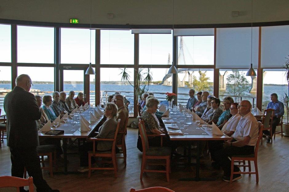 Bussimatkalla Raippaluodon Berny-ravintolaan Erkki Teppo kertoi ja esitteli vieraille Vaasaa ja niitä kaupunginosia, joiden läpi ajettiin.