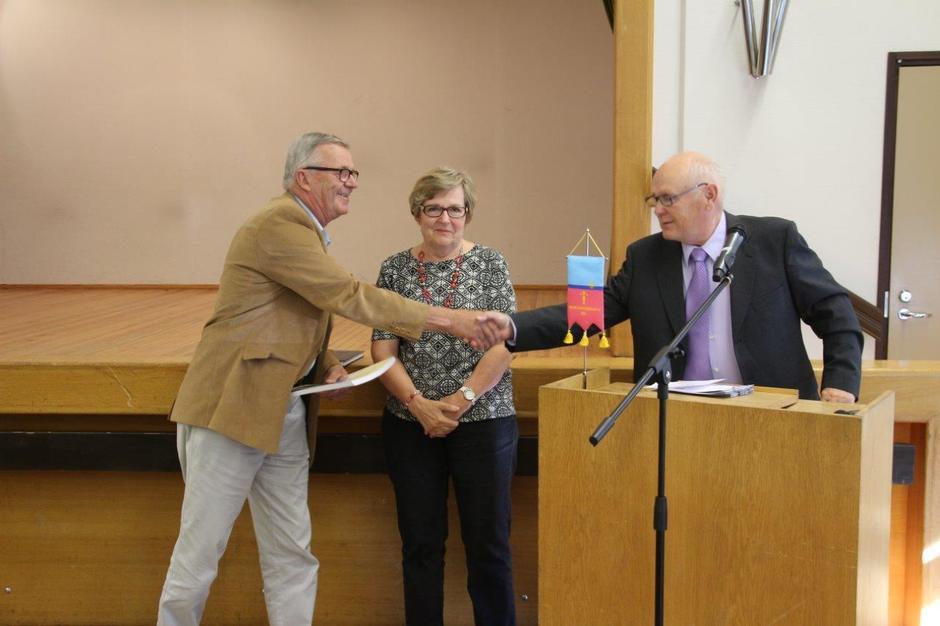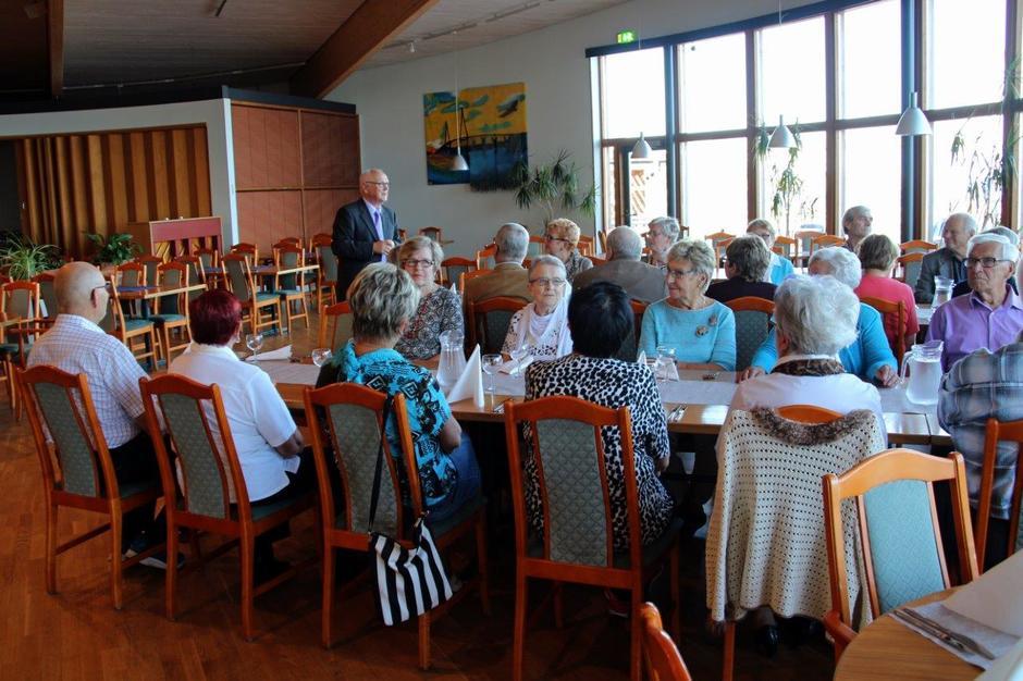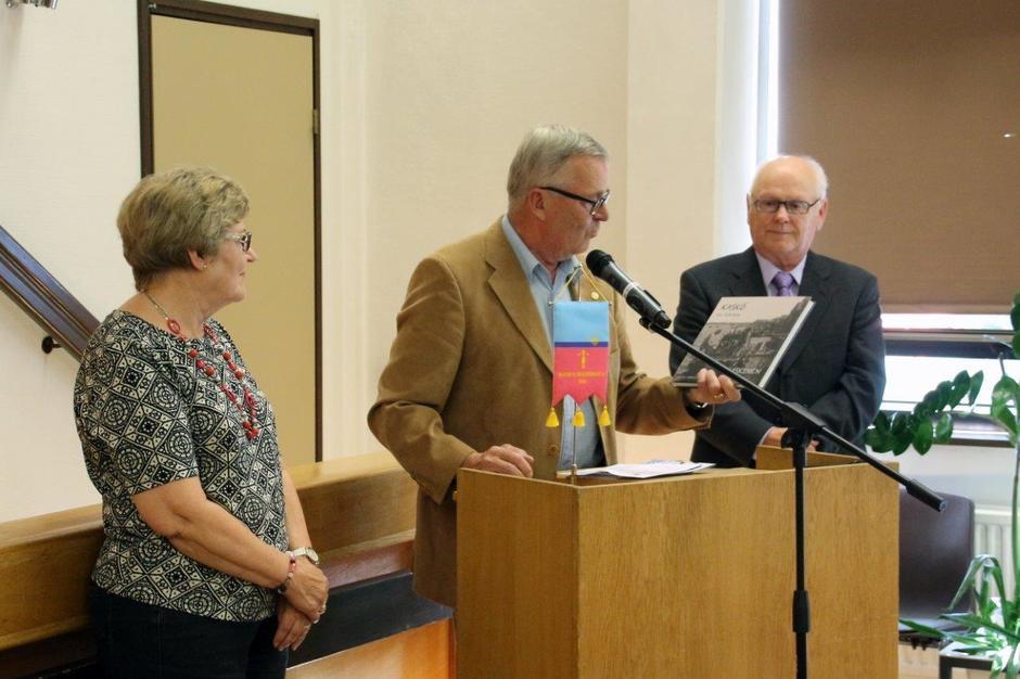 Puh.joht. Erkki Teppo ja siht. Ulla-Maija Salo luovuttivat Vaasan Eläkkeensaajat ry:n 50-vuotishistoriikin Kaskisten puh.joht. Aaro Sankalalle