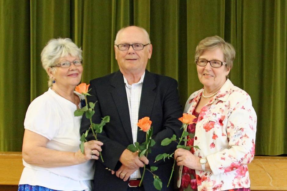 2016-05-26 puh.joht. Erkki Teppo kaappasi varapuh.joht. Helvi Tuonosen ja sihteeri Ulla-Maija Salon kainaloonsa kevätkauden päätteeksi