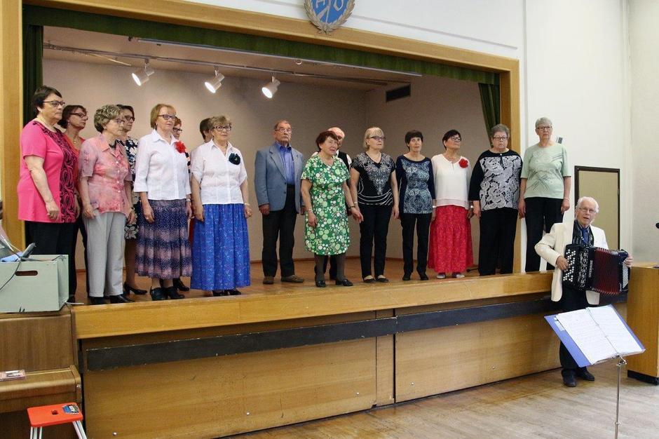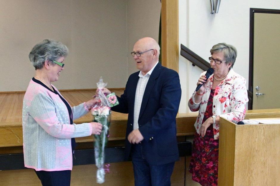 2016-05-26 puh.joht. Erkki Teppo ja sihteeri Ulla-Maija Salo kukittivat "yläkerran" sihteerin lähtemään eläkkeelle