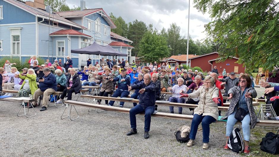 Juhlaväki taukojumppaa odotellessaan palkintojenjakoa