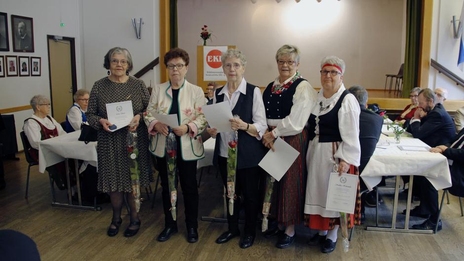 EKL:n hallituksen myöntämän kultaisen ansiomerkin saivat: vas. Liisa Siren, Anneli Törmä, Kaisu Luhtala, Birgitta Vuorinen ja Sinikka Hakomäki