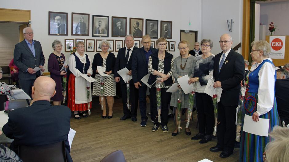 EKL:n Pohjanmaan piirin myöntämän hopeisen ansiomerkin saivat: vas. Mikko Vähä-Koivisto, Ulla Westerlund, Irma Tuomaala, Anneli Mäenpää, Seppo Lautamäki, Jorma Kivimäki, Heljä Järviö, Pirkko-Liisa Kalttonen, Ritva Heiman, Tuomas Perkiö ja Sisko Kuusisto. Muutama hopeamerkki jäi jakamatta poissaolon takia, jaetaan kerhossa.