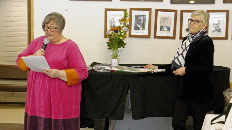 Ansiomerkkien jakoon valmistautuvat EKL:n järjestöjohtaja Petra Toivonen ja EKL:n Pohjanmaan piirin puheenjohtaja Anja Heinänen