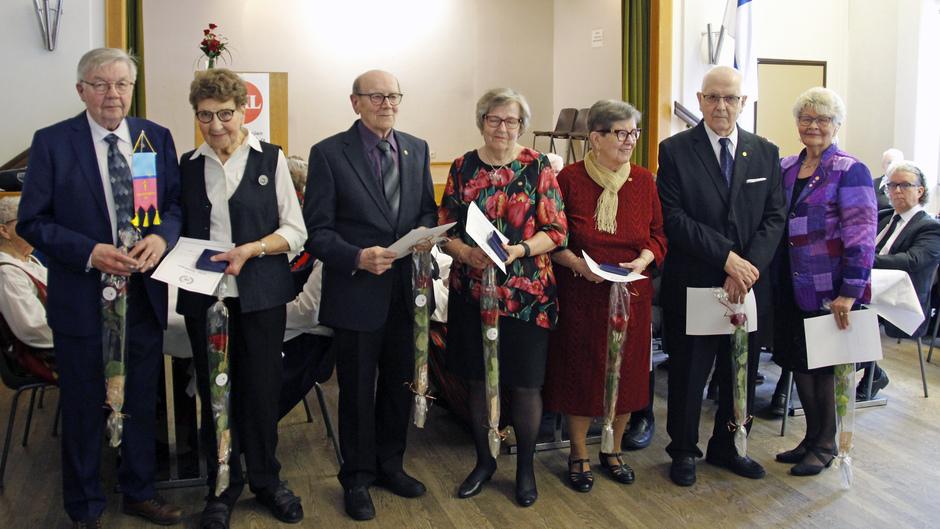 Lisäksi suurena yllätyksenä kaikille saajille jaettiin EKL:n tunnustusmitali: oik. Helvi Tuononen, Mauri Vieri, Mailis Vieri, Ulla-Maija Salo, Kosti Laine ja Liisa Palokangas sekä yhdistyksen myöntämä viiri annettiin Niilo Hamarille ja toinen Leena Carpille tarkoitettu viiri jäi jakamatta poissaolon takia.