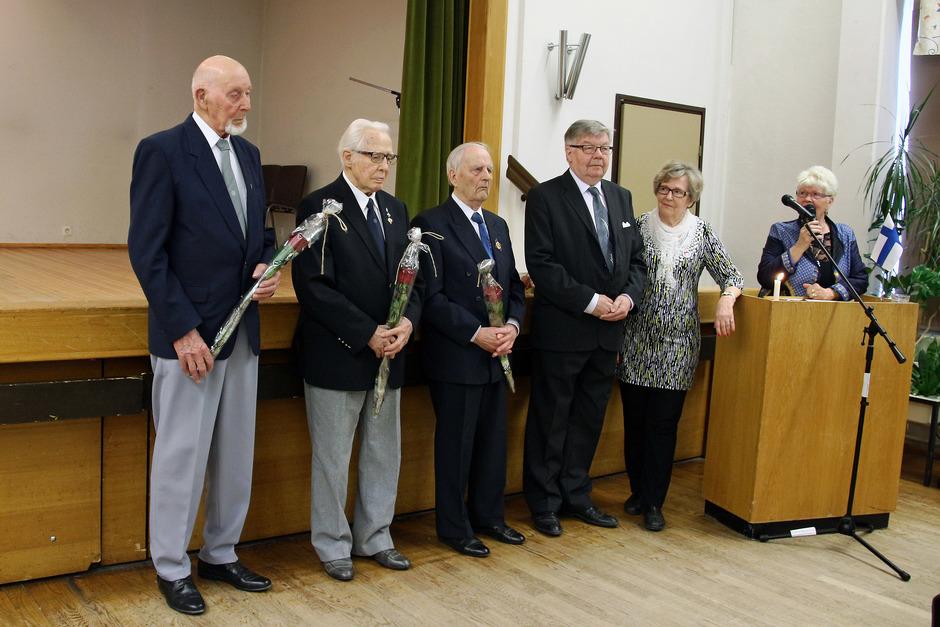 2016-04-21 veteraanit Eskil Ojala, Voitto hahto ja Olle Malmberg sekä kukittajat piirin puh.joht. Niilo Hamari ja yhd.sihteeri Ulla-Maija Salo + juontaja yhd. varapuh.joht. Helvi Tuononen