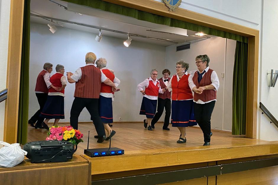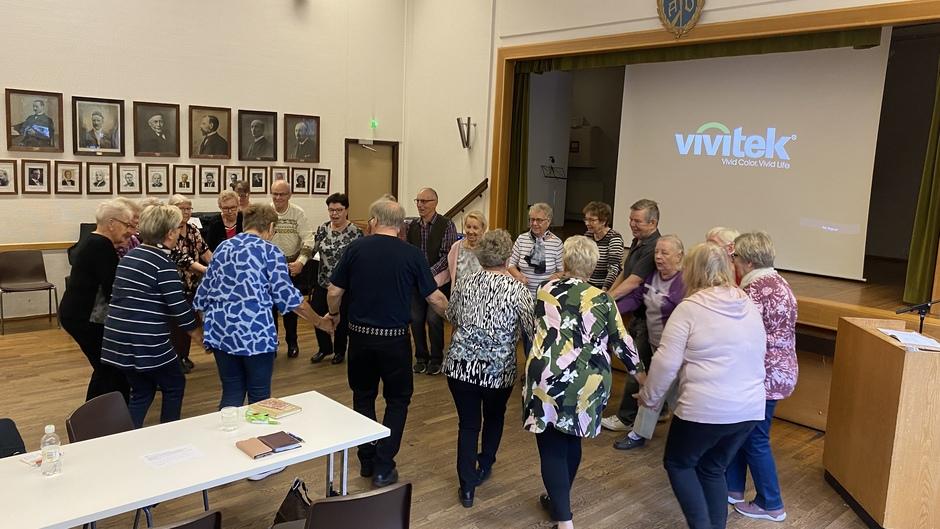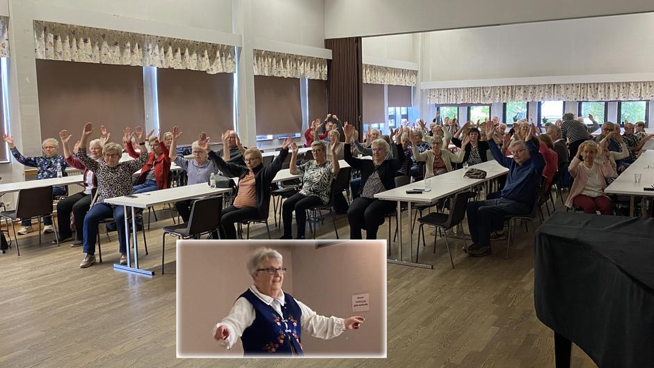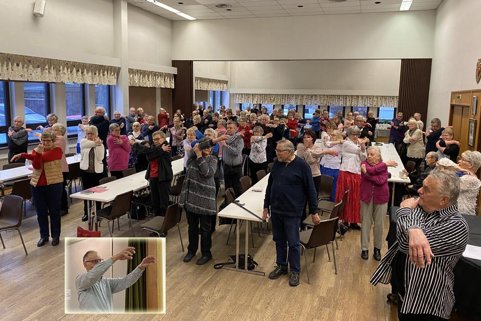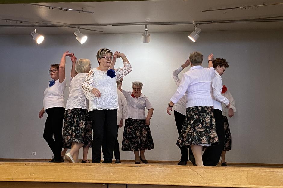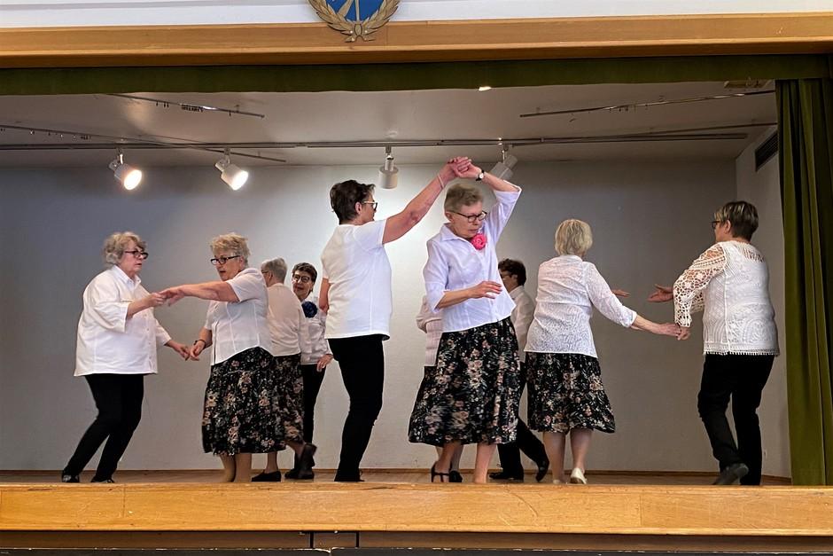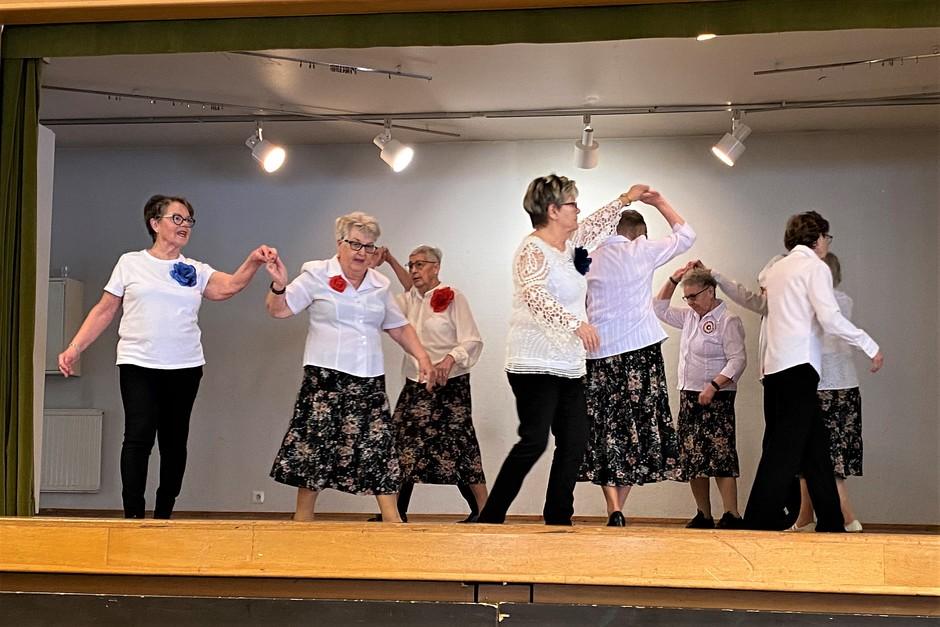 2023-11-30 Senioritanssijat näyttivät Macarena-tanssin mallia yleisölle ja----