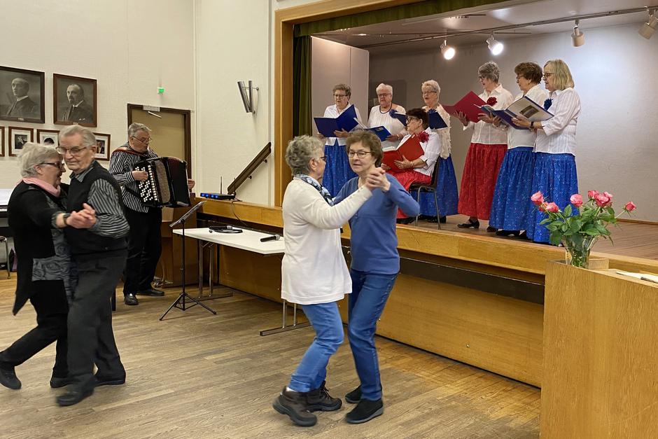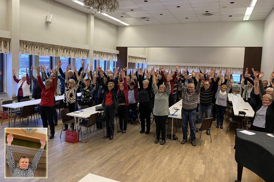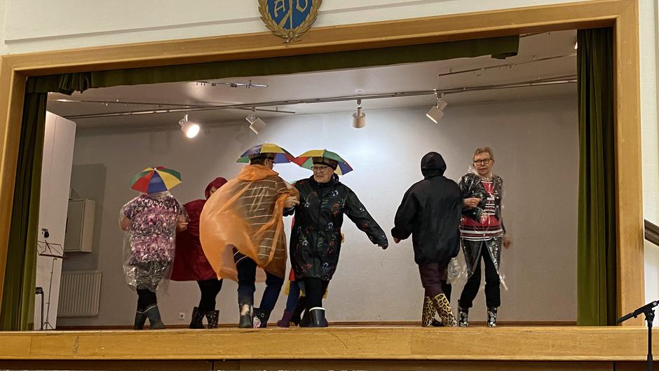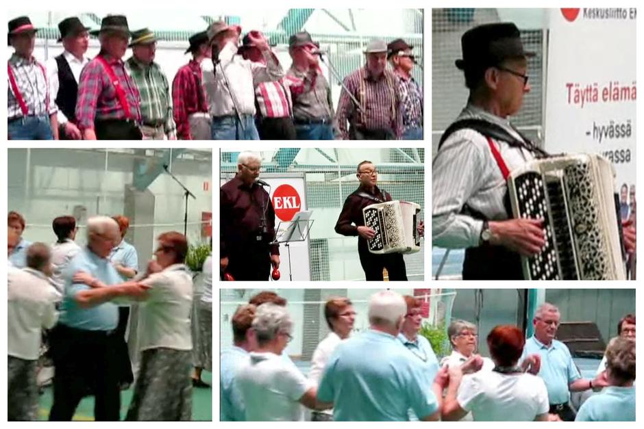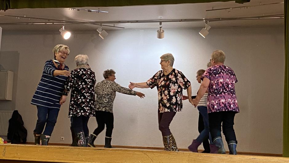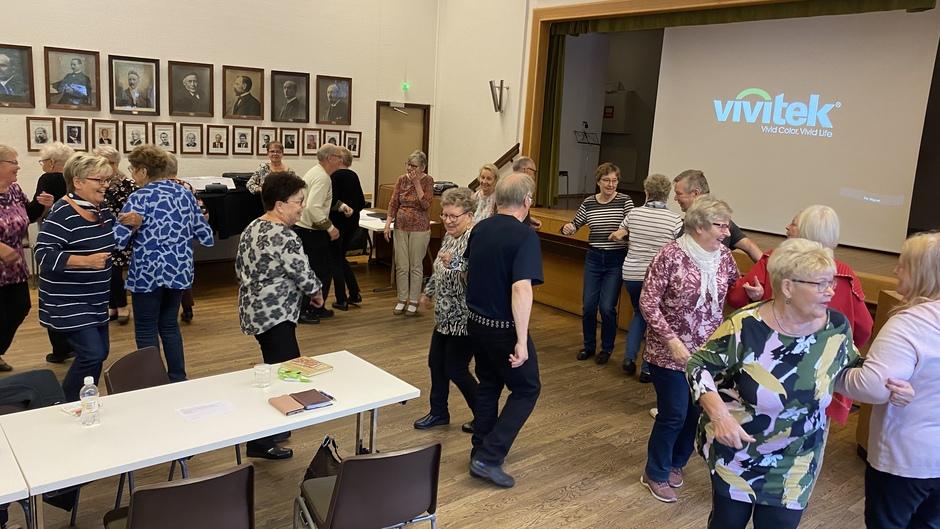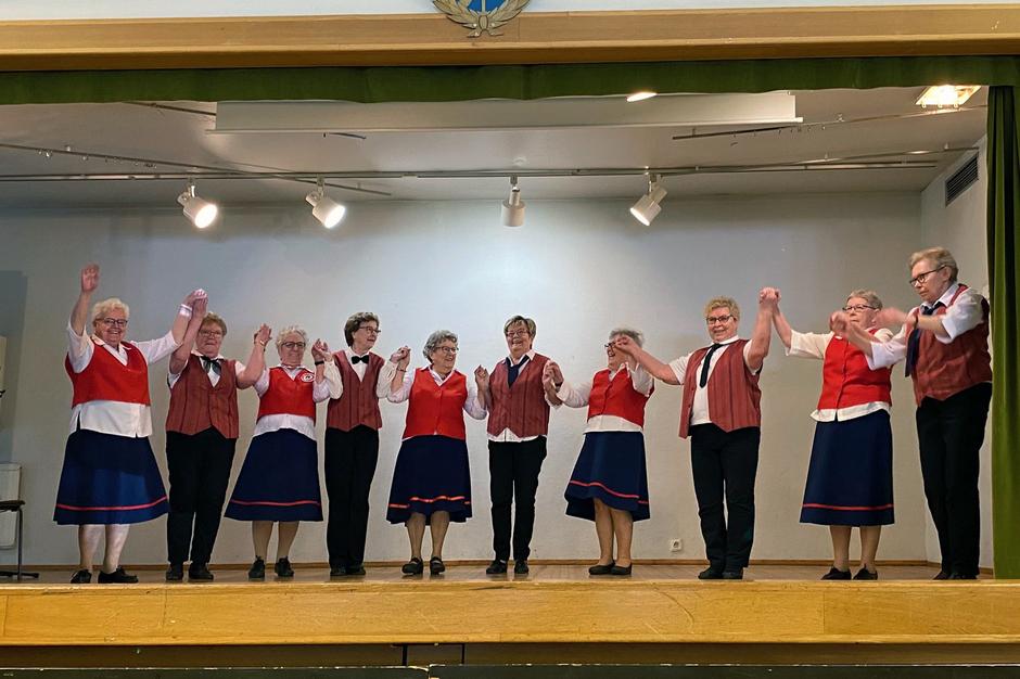 2023-11-30 Senioritanssijat näyttivät Macarena-tanssin mallia yleisölle ja----