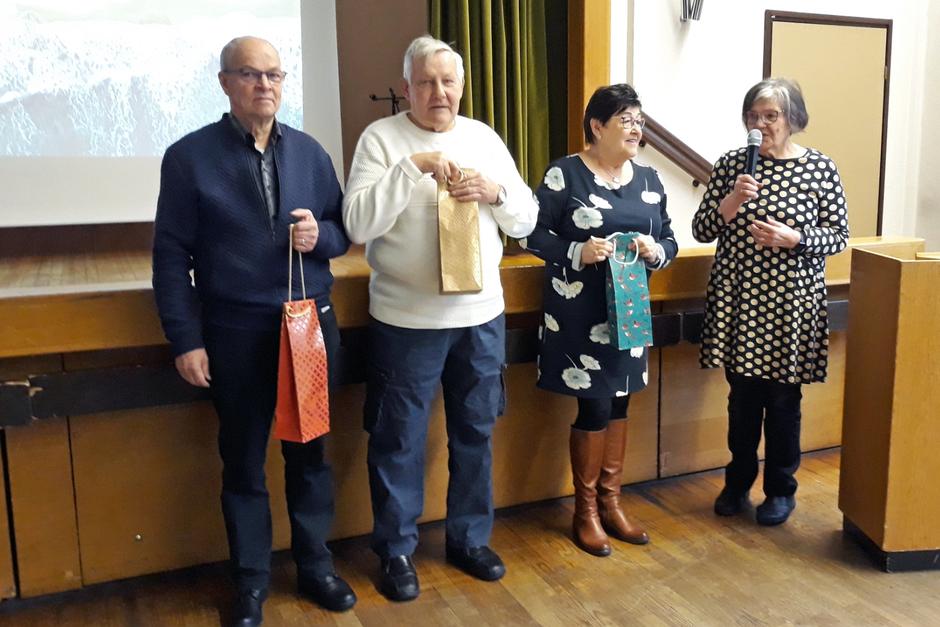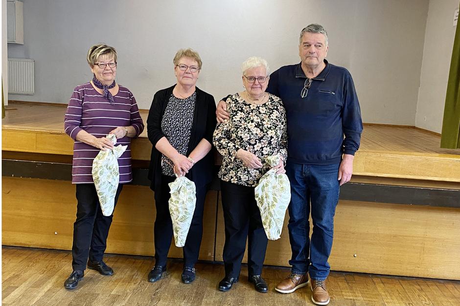2023-03-23 Pauli Haavisto kiitti Birgittaa, Irmaa ja Riittaa kukkakimpulla heidän avustaan Roikan tansseissa sunnuntaina