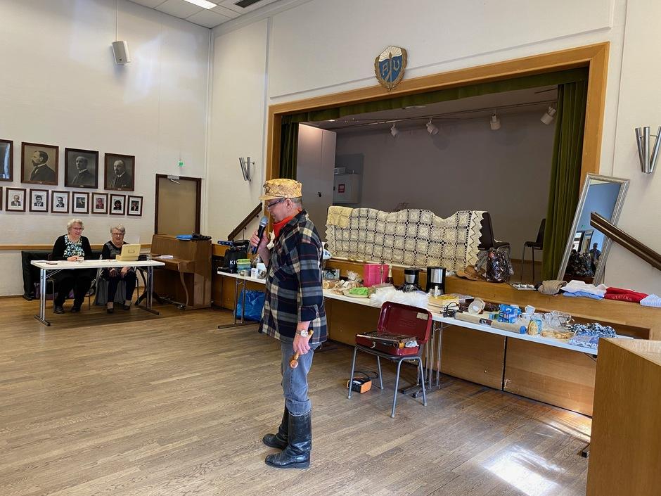 2023-04-20 Ensimmäinen torstaikerhossa pidetty huutokauppa. Meklarina Hessu Keränen, kirjureina ja rahastajina Sinikka ja Anneli ja lahjoitustavarat vaihtoivat omistajaa.