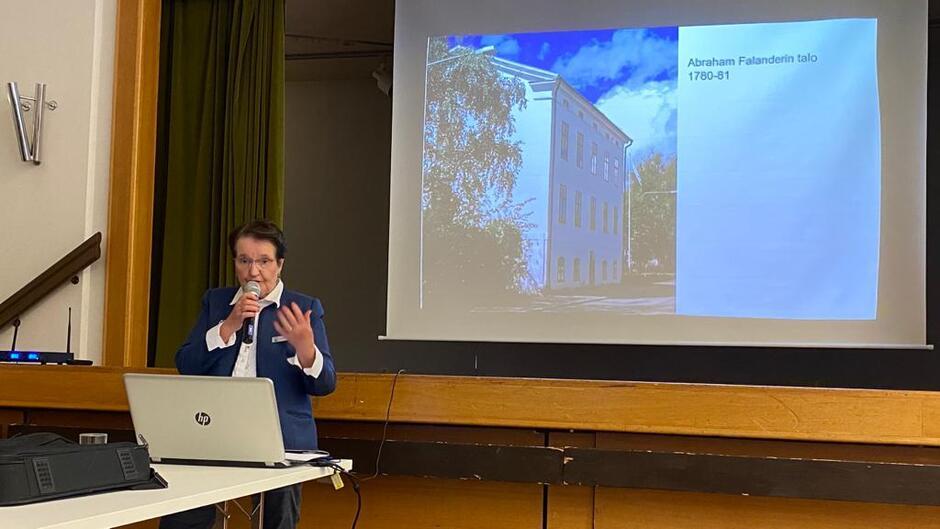 2023-08-31 Eva Reinikainen Vaasan Opaskerhosta kävi esittelemässä Vaasan arvotaloja. Kuvassa Vanhan Vaasan nykyinen museo, joka on ensimmäinen kivitalo Vaasassa ja ainut joka säilyi Vaasan palossa v. 1852. Mielenkiintoinen esitys arvotaloista ja niiden historiasta.