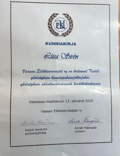 13.3.2025 Liisa Siren kunniapuheenjohtaja