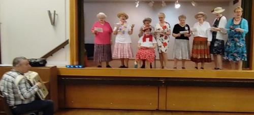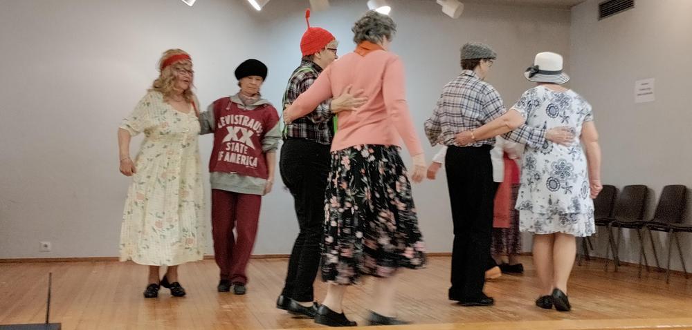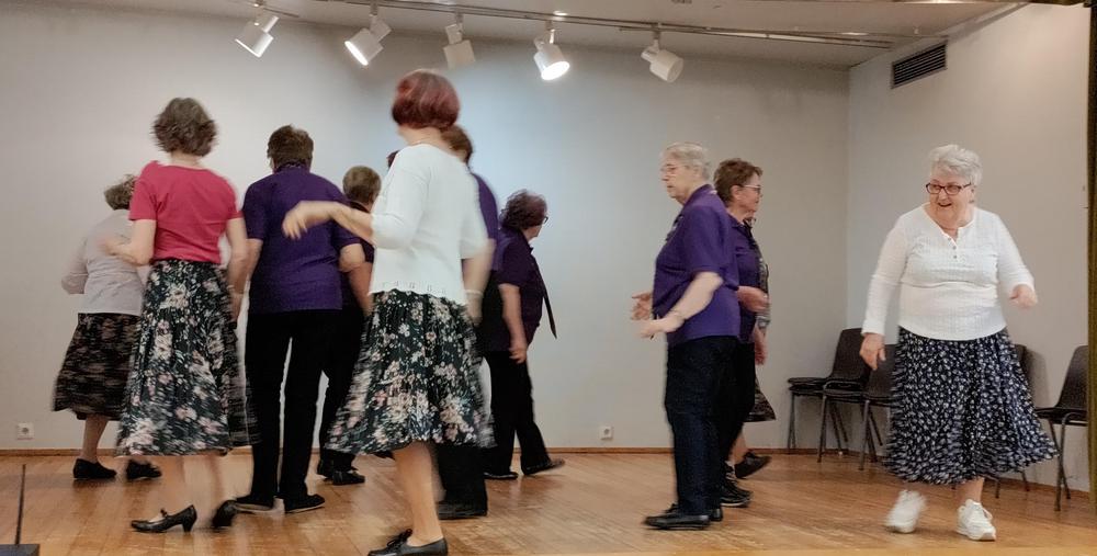 Yllä olevissa kuvissa: Yllä vas, kavalkaadin juontaja Anneli Mäenpää, seur. Tuomas Perkiö (Nestorit), oik. U-M Salo (Muistin virkist. arvoituksia). Alla vas. Heikki Keränen (kesäkuun runo), oik. Rivitanssijat.